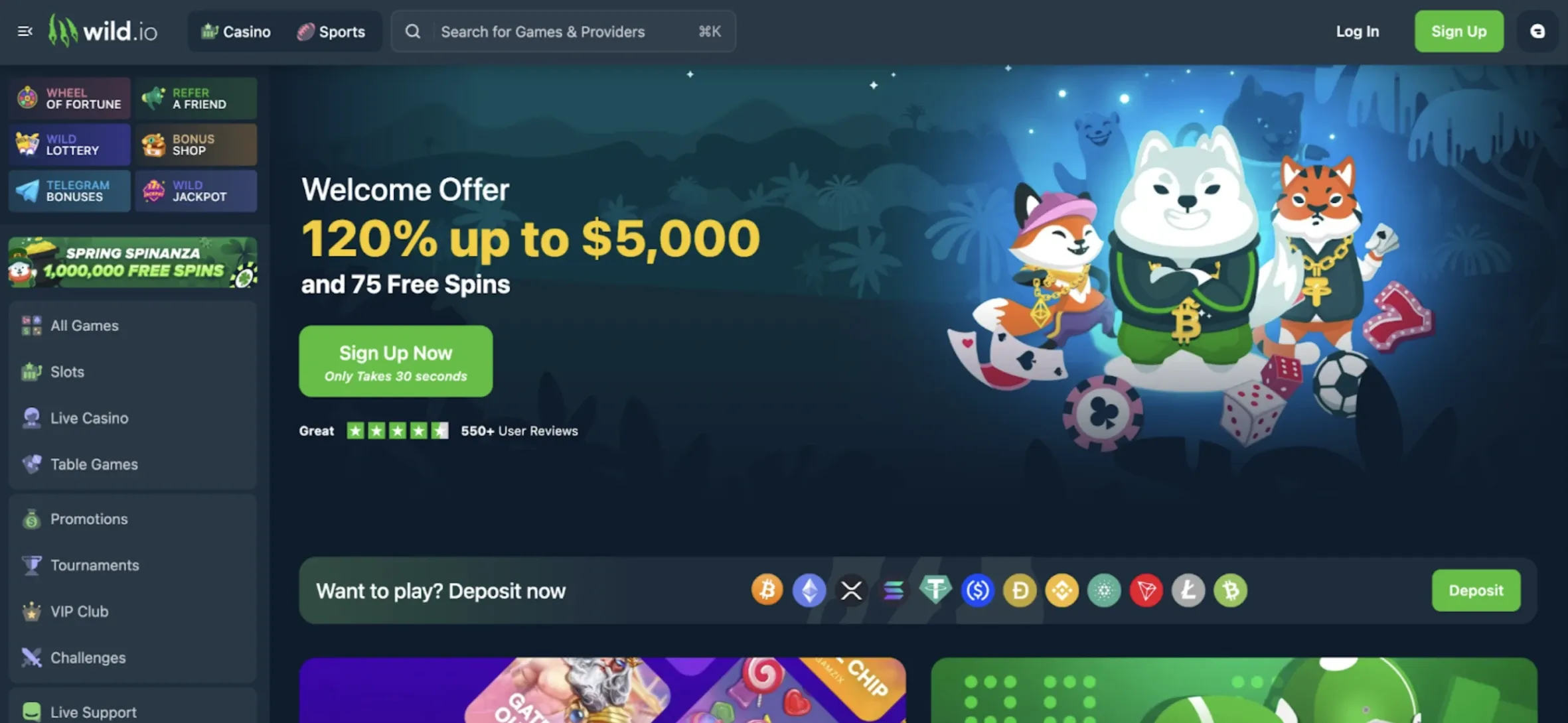 Wild.io is popular for its daily rewards and a 30-level loyalty program. It boasts 7,000+ games, including live dealer options and titles from Evolution Gaming and Pragmatic Play. Its welcome package and consistent cashback and rakeback rewards keep players engaged.