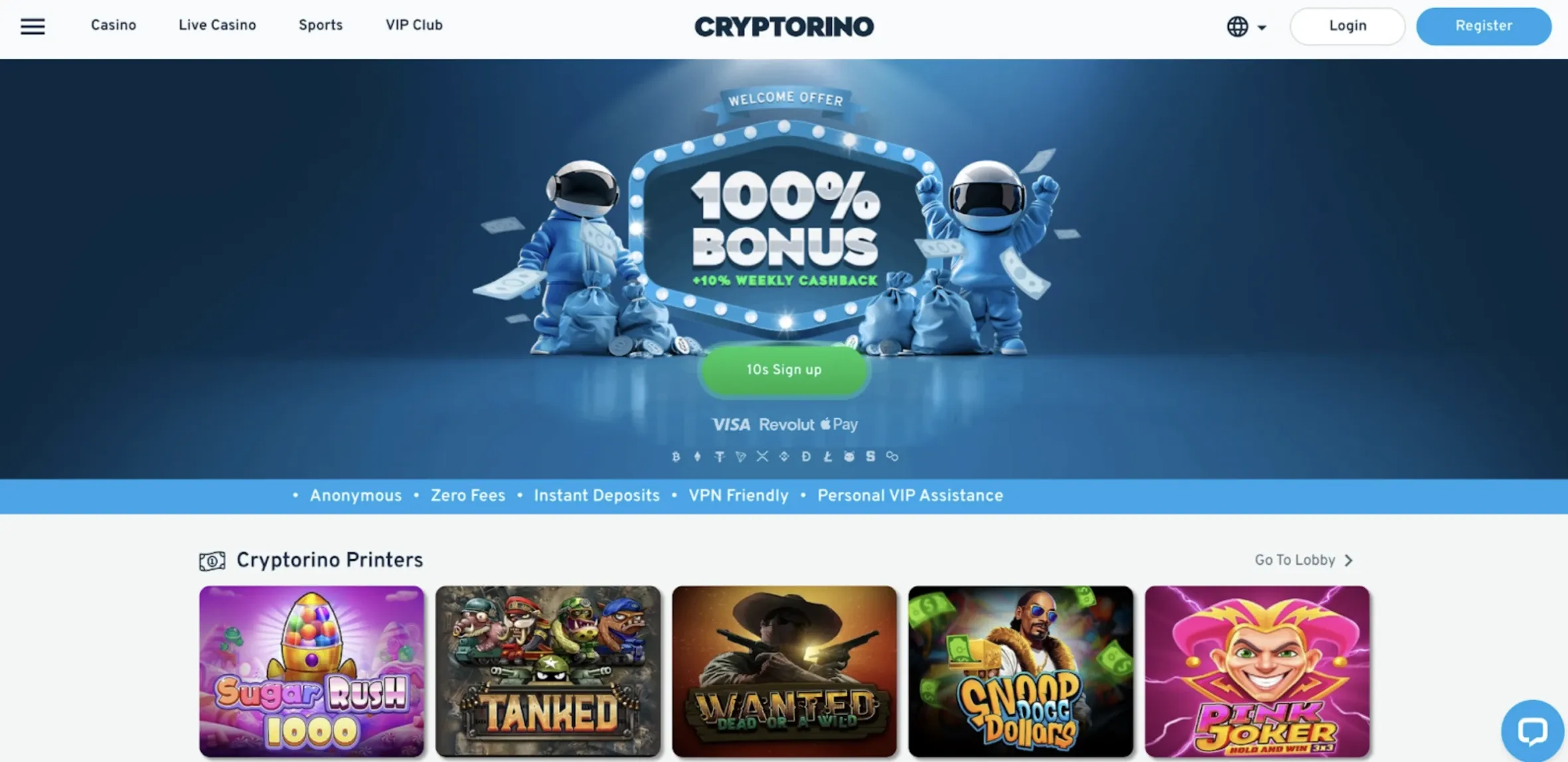 Cryptorino offers Metamask wallet integration and a wager-free 10% weekly cashback program. Its 6,300+ games and stellar live casino section make it a strong contender.