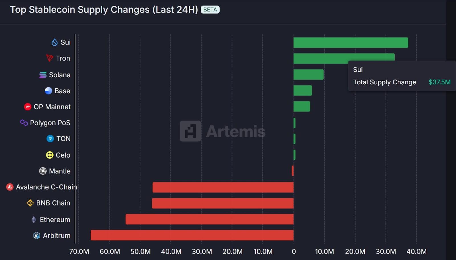 Consequently, Sui (SUI) experienced a significant increase in stablecoin liquidity, recording the highest 24-hour inflow among major blockchains.