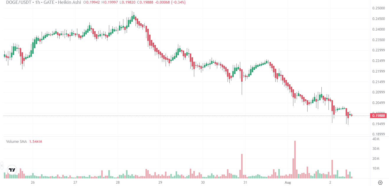 The 1-hour Heikin Ashi chart reveals DOGE's decline from $0.23 on July 26th to $0.1988. Price action has formed a pattern of lower highs and lower lows, suggesting persistent selling pressure in the short term.