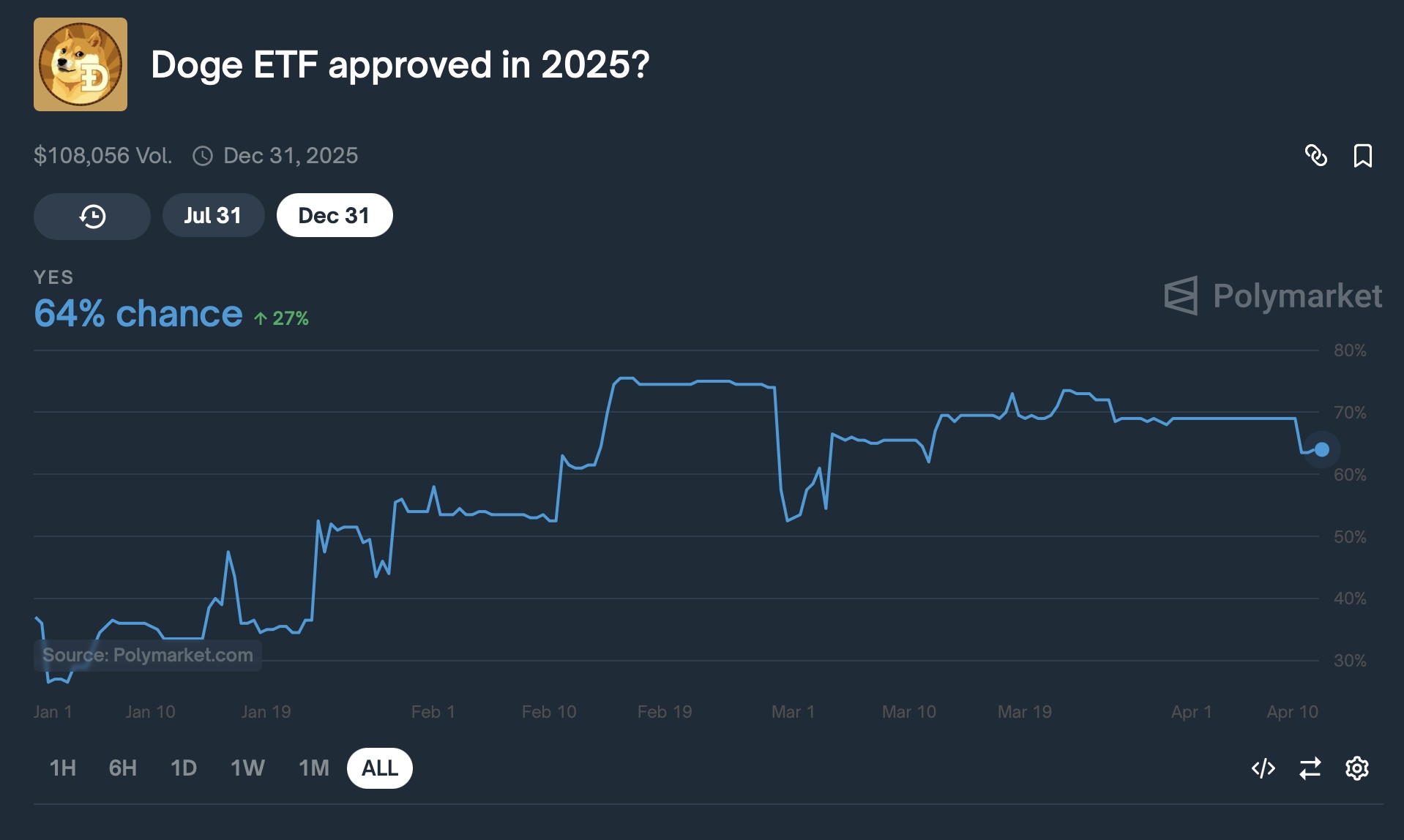 Seyffart estimates a 75% probability of SEC approval for the Dogecoin ETF, while the prediction market Polymarket puts the likelihood at 64%.