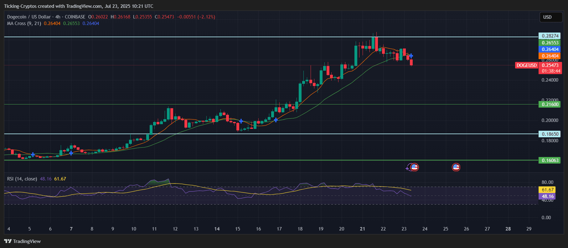 Dogecoin experienced a rapid surge from below $0.18 to almost $0.28 in less than two weeks. However, the 4-hour chart now suggests a diminishing bullish momentum: