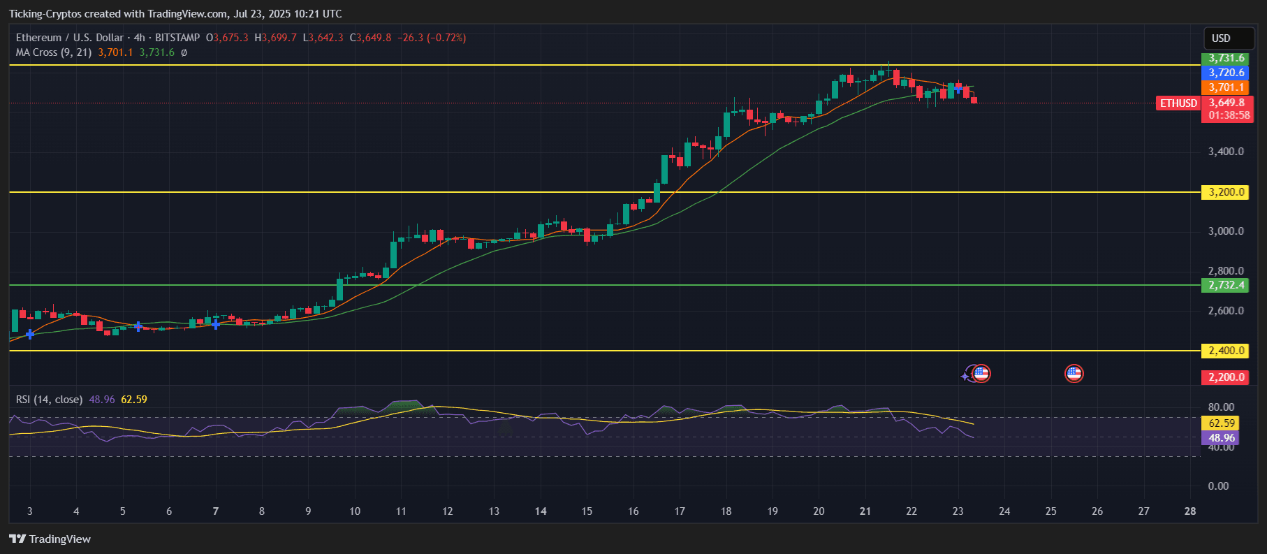 Ethereum surged from $2,700 to $3,731 but is now declining below short-term moving averages: