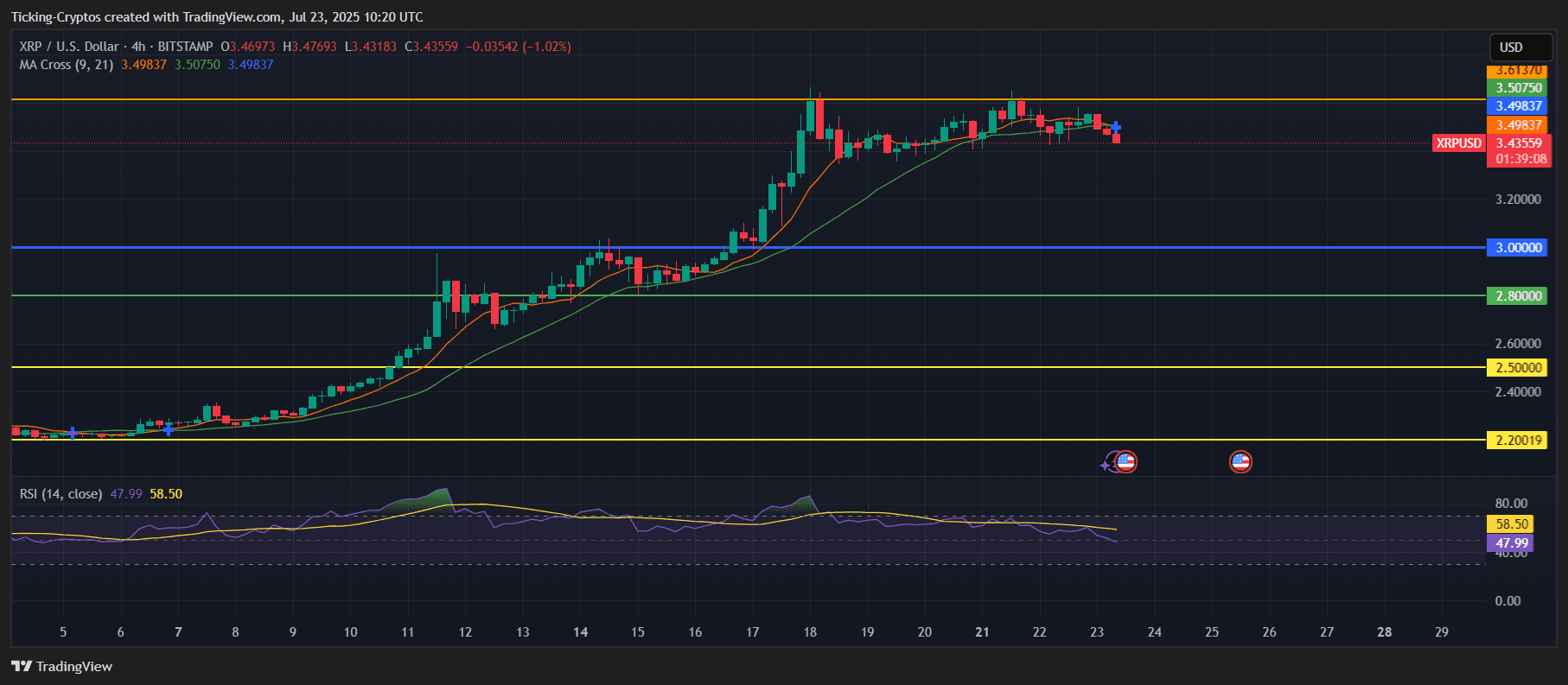 XRP experienced a strong rally in mid-July, rising from $2.20 to over $3.61. However, this rally is now losing steam, with early signs of a reversal: