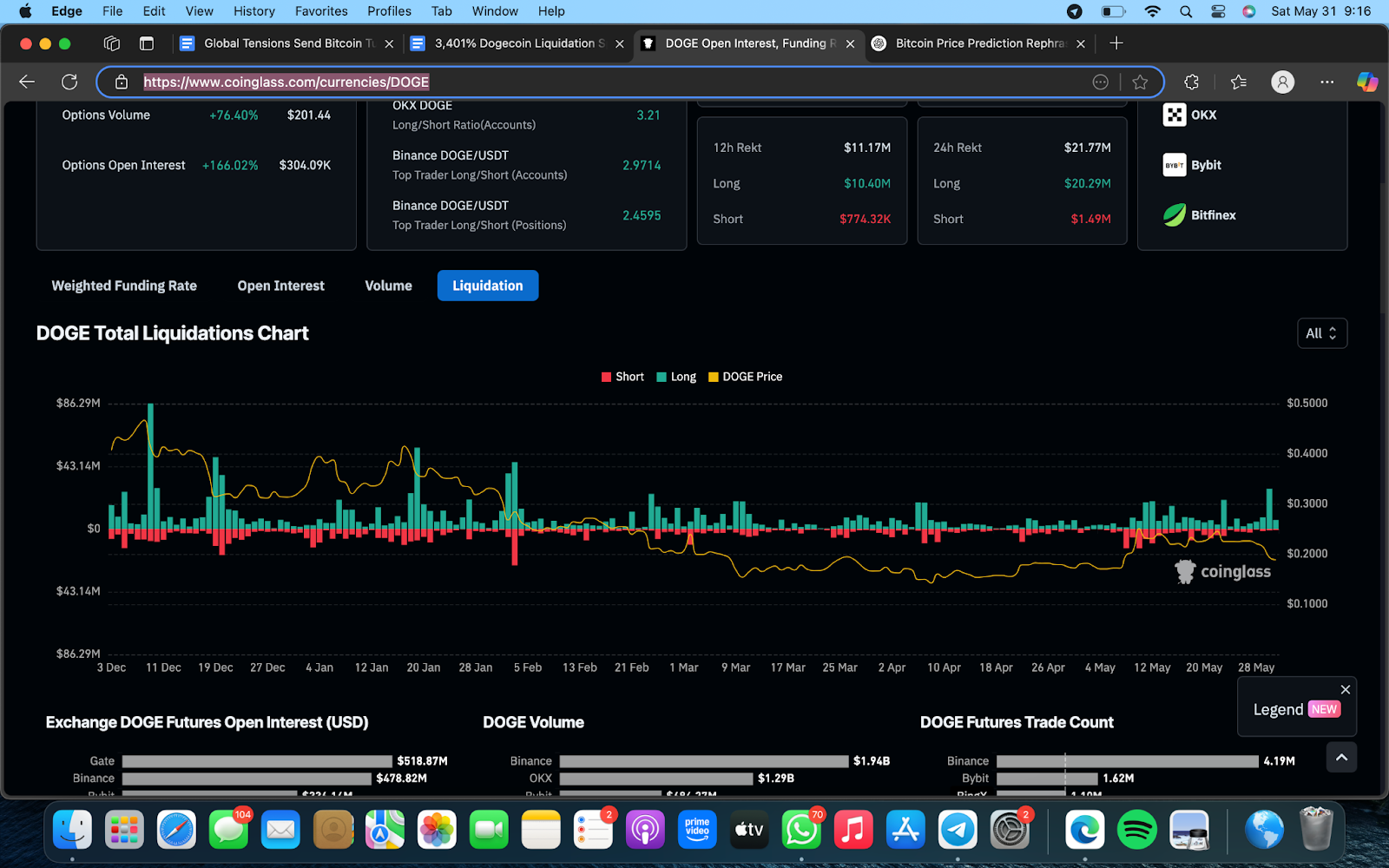 Dogecoin's (DOGE) liquidation surge mirrors trends observed in Bitcoin's derivatives market, but the meme coin has experienced a more pronounced price decline. Despite this correction, market activity surrounding Dogecoin (DOGE) remains active. Trading volume increased by over 53% to $2.16 billion, suggesting potential buyer interest at these lower prices.