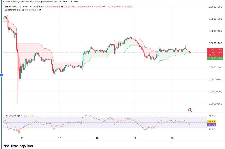 The daily chart structure remains within a descending triangle, with resistance near $0.00001150 and support at $0.00001000. Analysts caution that a drop below key support could expose deeper price zones near $0.00000940.