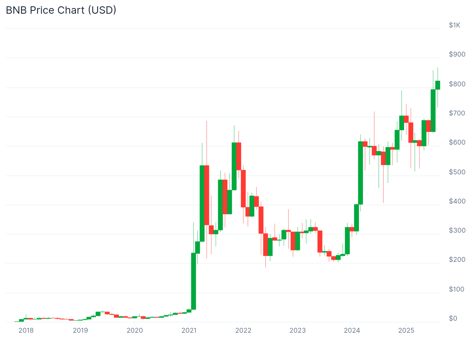 The BNB crypto outlook sees potential for $1,000–$1,500 targets if demand from both retail and institutional sides persists.
