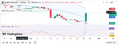 On the upside, the first key resistance is found at $1.27, which aligns with the 20-day simple moving average (SMA). A decisive move above this resistance would signal a potential trend reversal and could push AKT toward $1.50. If momentum continues to build, the next major resistance level lies at $1.72, representing a crucial breakout target for AKT.