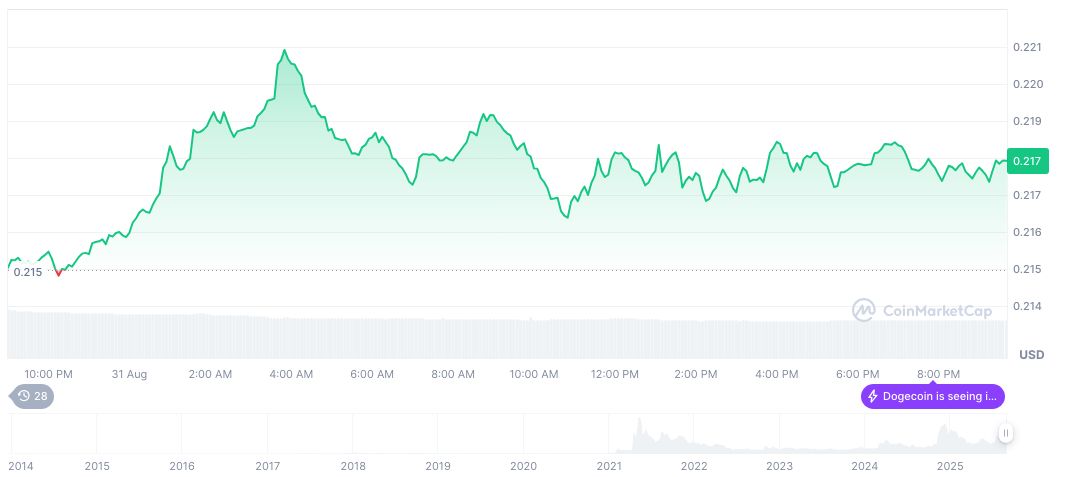 According to CoinMarketCap, Dogecoin (DOGE) is currently priced at $0.22, with a market cap of approximately $32.83 billion. Its 24-hour trading volume stands at $946.61 million, although this has decreased by 17.64%. Over the past 90 days, DOGE has shown a positive price change of 13.06%, reflecting resilient market interest.