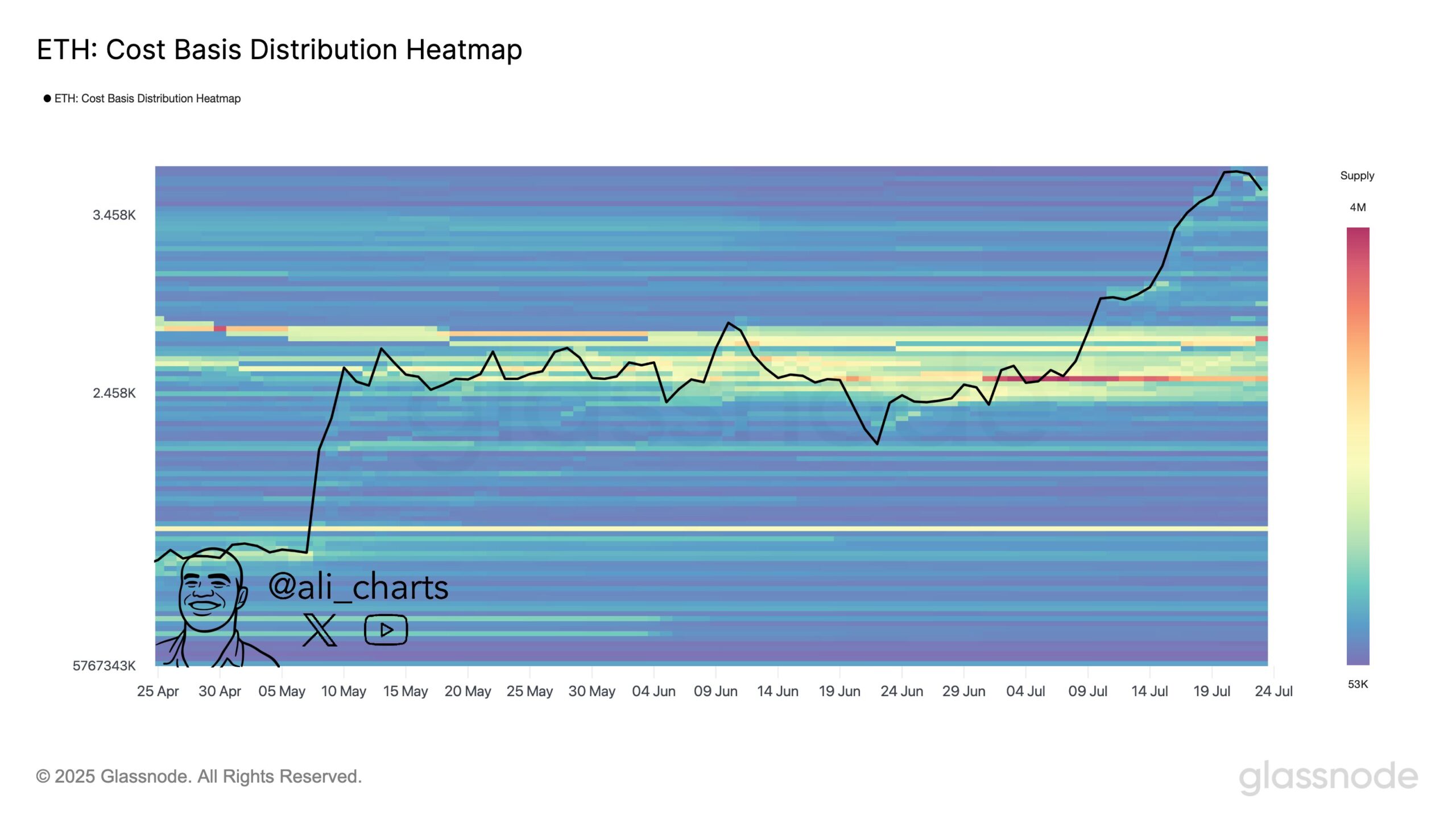 In his July 25, 2025, post on X, Martinez referenced a Glassnode chart illustrating Ethereum's supply concentration between $2,400 and $2,800, emphasizing its role as a consistent support level. This indicates that Ethereum's price increases have historically relied on this zone for stability. ETH investors might anticipate increased selling pressure should prices fall below this crucial threshold. The chart visually represents the cost basis with varying color intensity, showing how supply decreases as prices move away from the horizontal band.