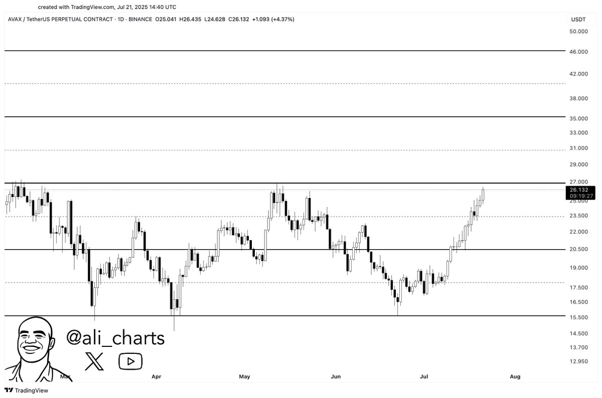 Turning to Avalanche, Martinez observed that the $27 level on the daily chart represents the upper limit of a nearly nine-week consolidation channel. A breakout above this level, accompanied by strong volume, could propel AVAX towards the next significant resistance point at $36.