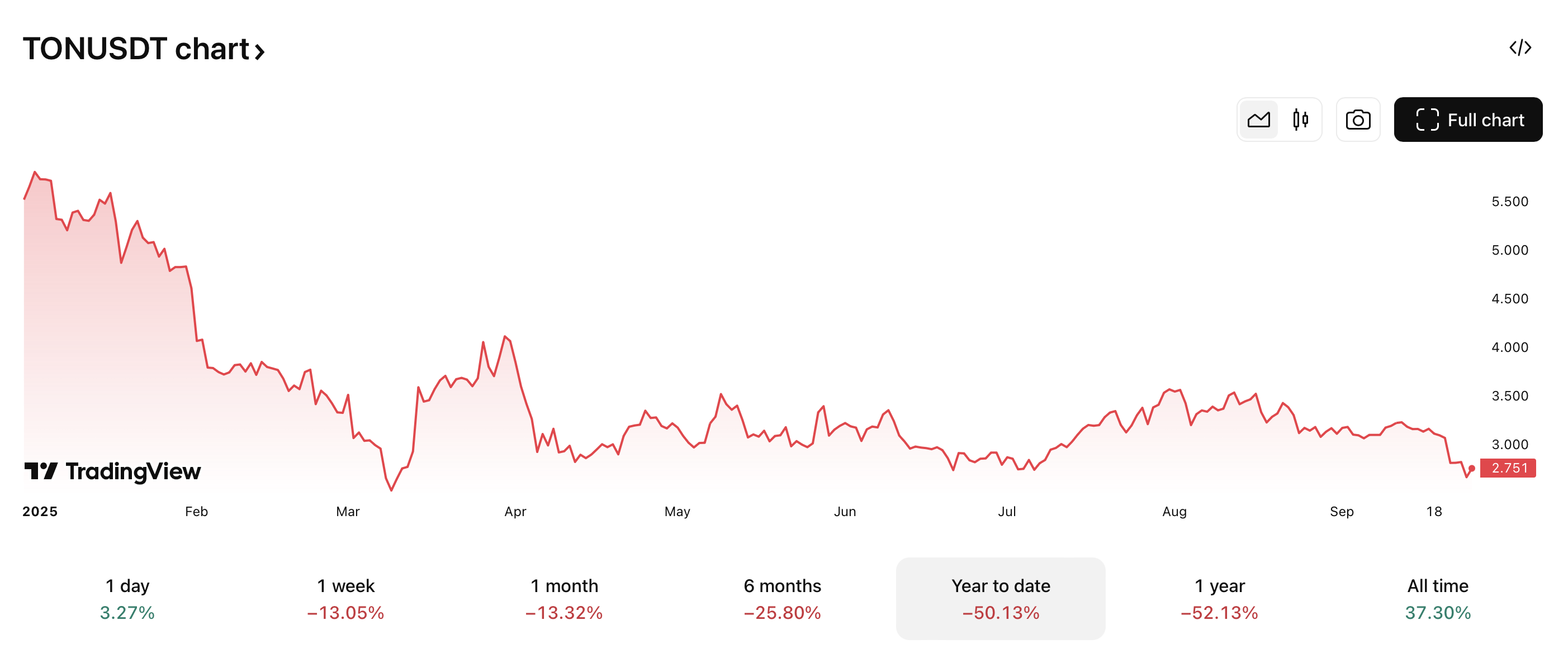 TON Strategy, the first TON treasury company to launch, began accumulating in August with a purchase of $713 million, and now holds around 217.5 million tokens. Its stock performance has also struggled, falling over 65% in the past month.