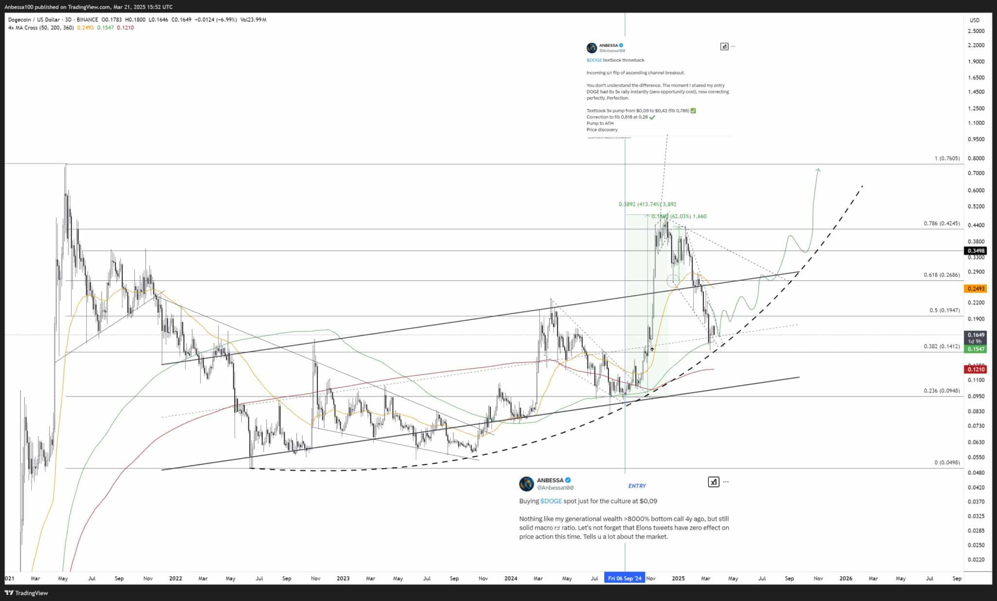 Popular trader ANBESSA provided updates on several altcoins, including Dogecoin (DOGE). Trading around $0.168, DOGE appears to be consolidating but remains resilient near strong technical support levels. "DOGE continues to hold the 3-day 200MA and mid-channel trendline as support. I entered around 9 cents – one of the best swing entries. While the recent bounce at $0.26 failed, this zone could be DOGE's last chance to prove its strength," ANBESSA noted. A drop below $0.14 – beneath the 0.382 Fibonacci level – would be a negative sign. However, if past performance is any indication, Dogecoin may still offer another substantial upward move.
