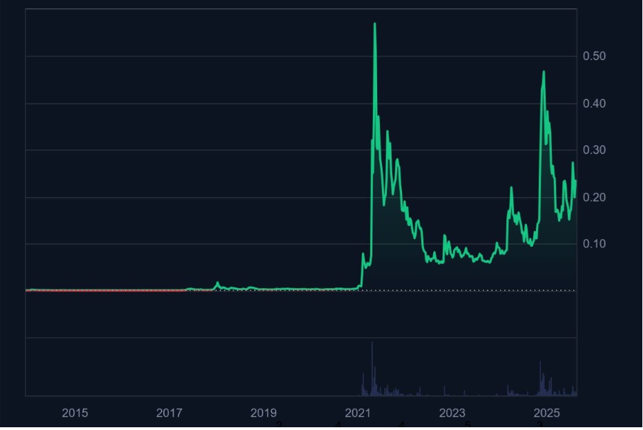 Dogecoin began in late 2013 as a playful parody of Bitcoin, inspired by the iconic Shiba Inu meme. For years, it traded for virtually nothing—fractions of a cent—before the market suddenly turned its attention to the coin. The real turning point came in early 2021, when Dogecoin surged from around $0.02 to nearly $0.74 in just a few months. That explosive rally delivered over 3,600% gains, fueled by retail enthusiasm, community power, and mainstream cultural momentum.