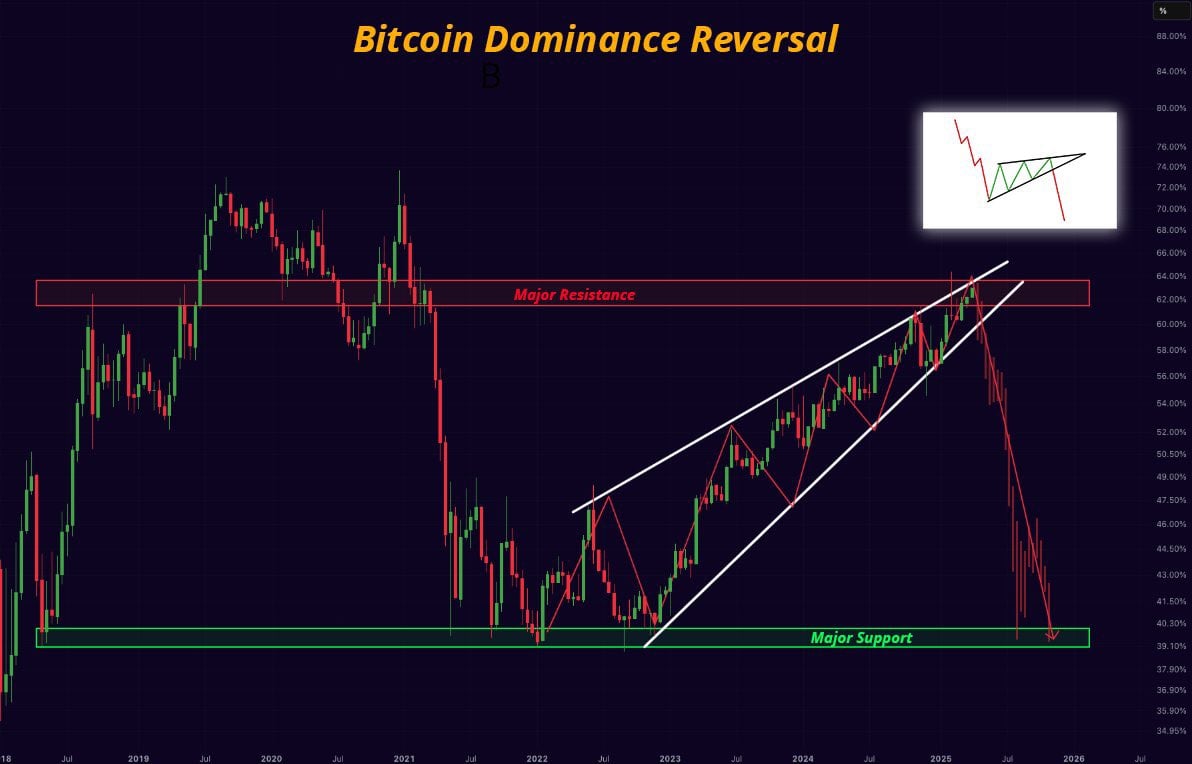 Market commentator Sensei suggests Bitcoin dominance might have already peaked, citing a rising wedge pattern on the BTC Dominance chart – a formation often interpreted as a potential reversal indicator.
