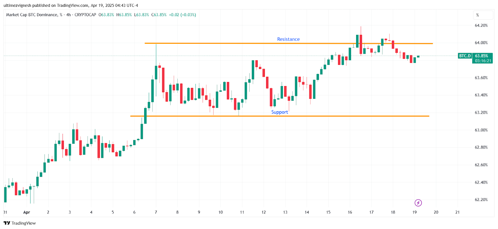 The four-hour BTC.D chart reveals that the April 7th high of 63.98% acted as strong resistance. While Bitcoin dominance briefly surpassed this level on April 16th, it has since fallen back below it, currently sitting at 63.83%. Continued downward pressure could test the monthly low of 63.16%, further bolstering altcoin optimism.