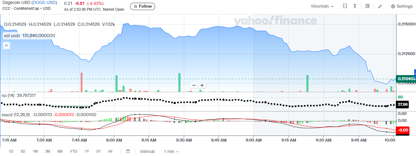 Dogecoin fell -4.43% in intraday action, slipping to $0.2104 amid persistent bearish momentum. The RSI reached 27.96, confirming deep oversold conditions. Meanwhile, the MACD widened on the downside, highlighting strong selling activity and lack of immediate recovery signs.