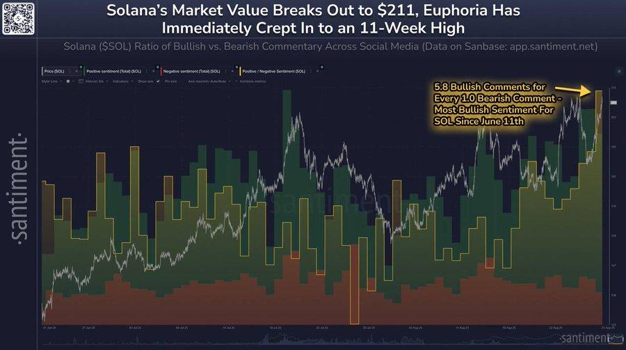 The shift isn’t just technical — retail traders are re-entering the market in force. Social sentiment around SOL has stayed bullish for more than two months, and institutional support is also building. Thirteen companies now hold Solana in their corporate treasuries, totaling more than 8.27 million SOL, valued at $1.72 billion.