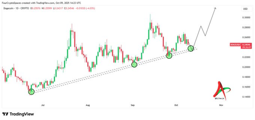 Dogecoin is once again showing strength when it matters most. According to trader FOUR | Crypto Spaces, DOGE price has now bounced off the same ascending trendline for the fourth time, and this consistent support could be the launchpad for another major move.