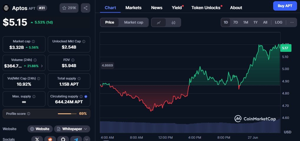 Currently, Aptos is trading at $5.17, reflecting a 5.53% gain over the last 24 hours. Market observers have noted that the $5.00 level is now acting as support, after previously hindering upward movement. The immediate support zone lies between $4.85 and $4.90, which has successfully held during previous price dips.