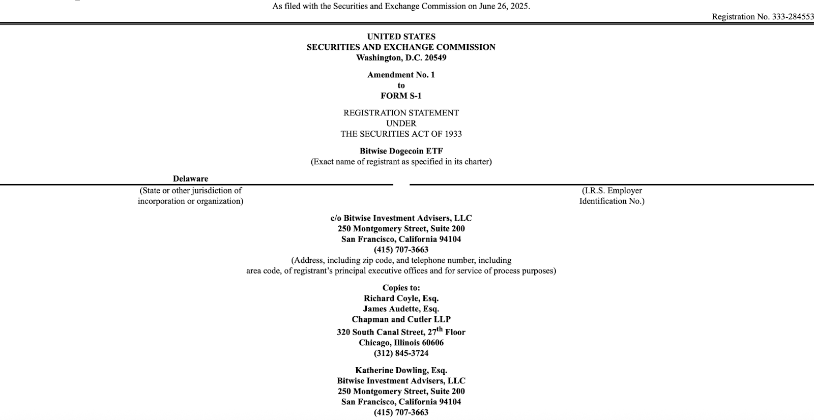 Bitwise amended the S-1 for Dogecoin ETF. Source: SEC