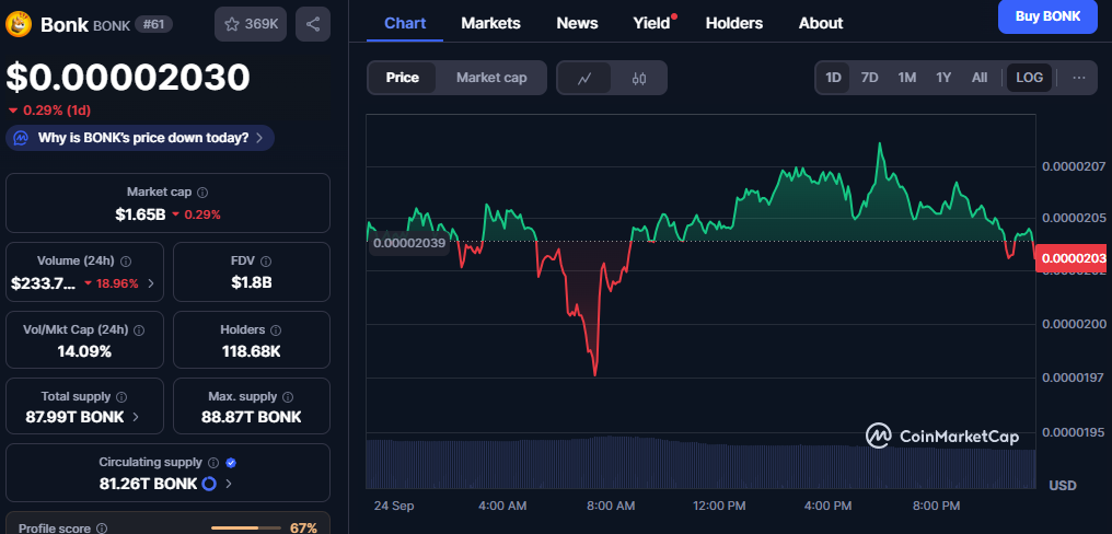 The price chart of Bonk has been oscillating in a more unstable trend as compared to other cryptocurrencies. The price was varying all day long, but with significant falls in the middle of the day. The price has hit its bottom, but it has gone up to some extent, which means that Bonk could undergo further changes as traders respond to markets.
