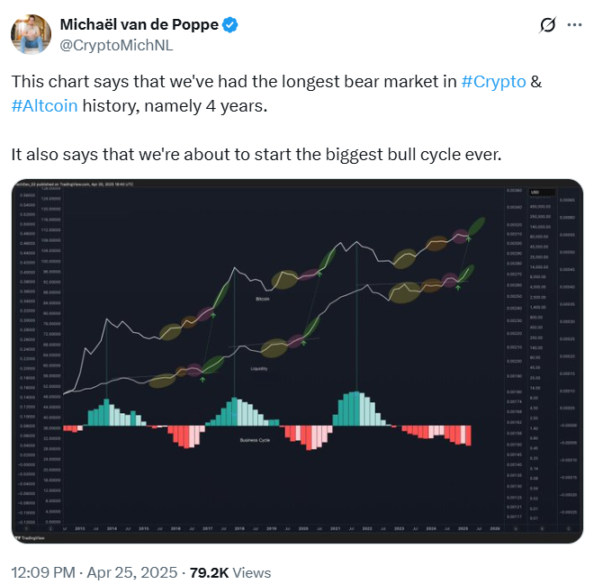 Popular trader and analyst Michael Van de Poppe has charted what he believes to be the longest bear market in crypto history, spanning four years from 2022 to 2025. He consequently predicts the market is poised for its largest bull cycle yet.