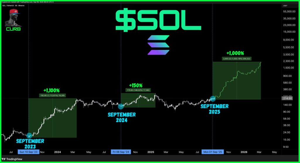 Forget autumn blues, if current form holds, Solana’s rally could be the story that finally turns Alt Season from myth to reality. Historically, September is a drag for crypto. Major coins fumble, confidence flickers, and altcoins, well, altcoins mostly fade into obscurity.