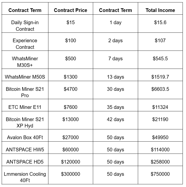Coin value fluctuations often put traders in a position where they end up at a loss due to reduced asset values. BestMiningPools offers a sustainable solution to these traders, offering them consistent, high-value contracts. Whether you are a beginner or a professional, you can make an investment based on your comfort level and generate returns despite the market fluctuations. Here is a list of Bestminingpools contracts: