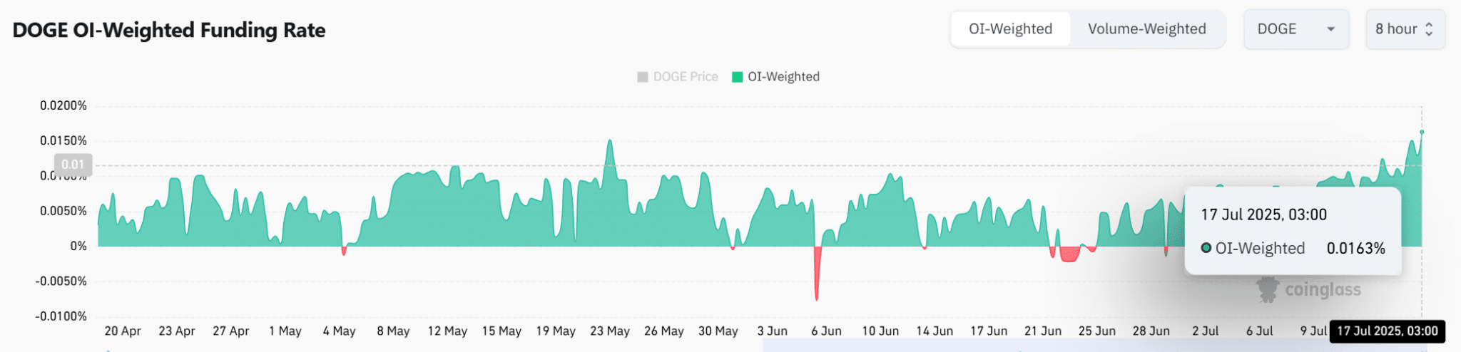 Data reveals that traders betting on upward DOGE price movement are now compensating those anticipating lower prices. The funding rate has reached 0.0163%. This signifies that bullish traders are dominating the market and are willing to bear a cost to maintain their positions.