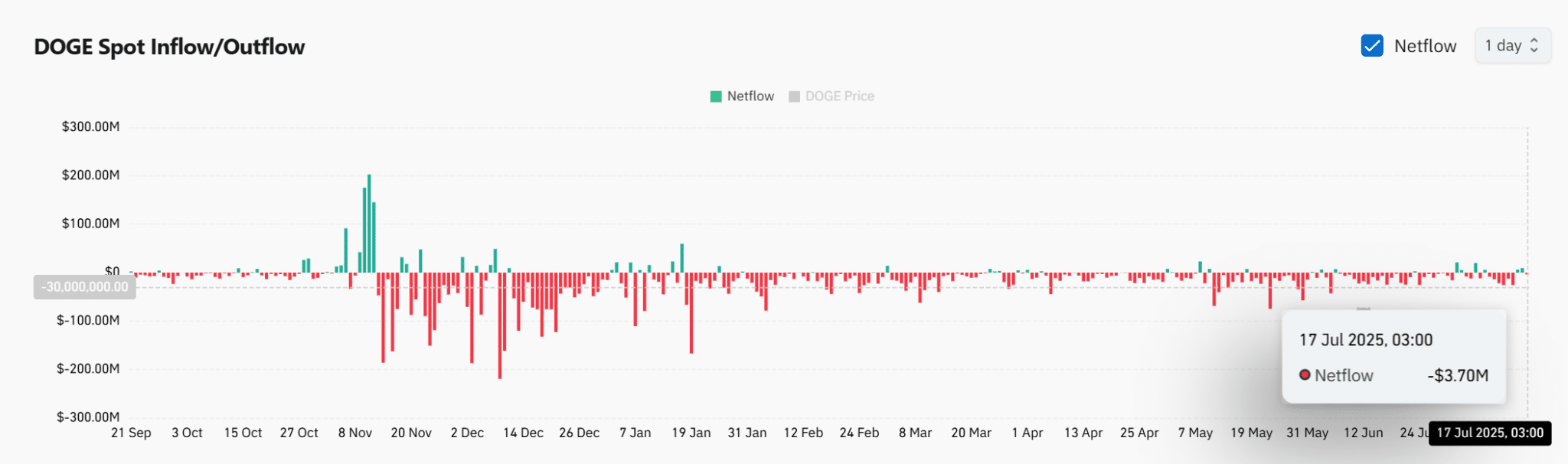 On-chain data indicates a net movement of DOGE away from exchanges, totaling $3.70 million. This outflow suggests a reduction in immediate selling pressure and may indicate that holders intend to hold their coins for a longer period. Typically, coins leaving exchanges imply that owners prefer self-custody, often during periods of accumulation.