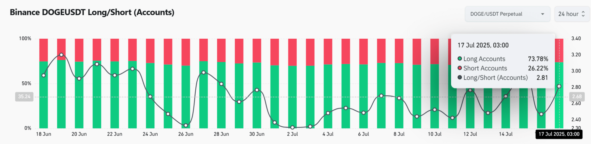 On Binance, 73.78% of DOGEUSDT traders are holding long positions. The Long/Short Ratio stands at 2.81, indicating a strong bullish bias. While this aligns with the positive sentiment, it also carries inherent risk. If prices decline, many long positions could face forced liquidation. Extreme long dominance can sometimes precede sharp price movements if sentiment reverses.