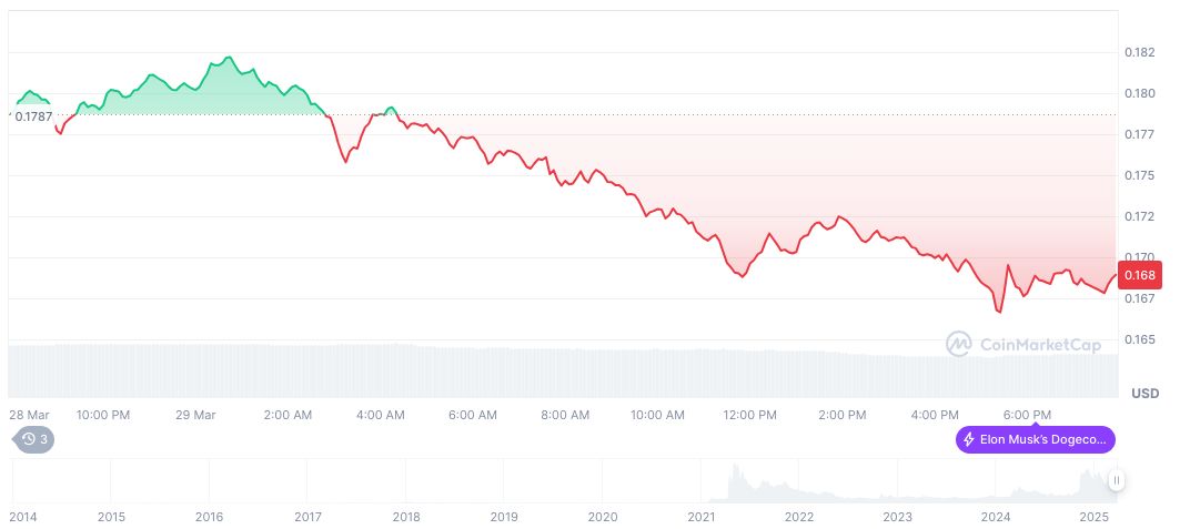 As of March 29, 2025, Dogecoin (DOGE) traded at $0.17, with a market cap of $25.08 billion. Over 24 hours, its volume reached $1.15 billion, experiencing a 5.61% price decline.