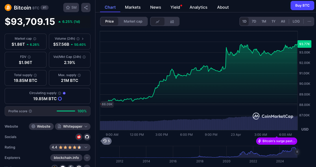 These combined announcements shifted market sentiment towards risk-on behavior. Bitcoin, already experiencing gains, reached a session high of $93,400. At the time of writing, Bitcoin is trading at $93,709.
