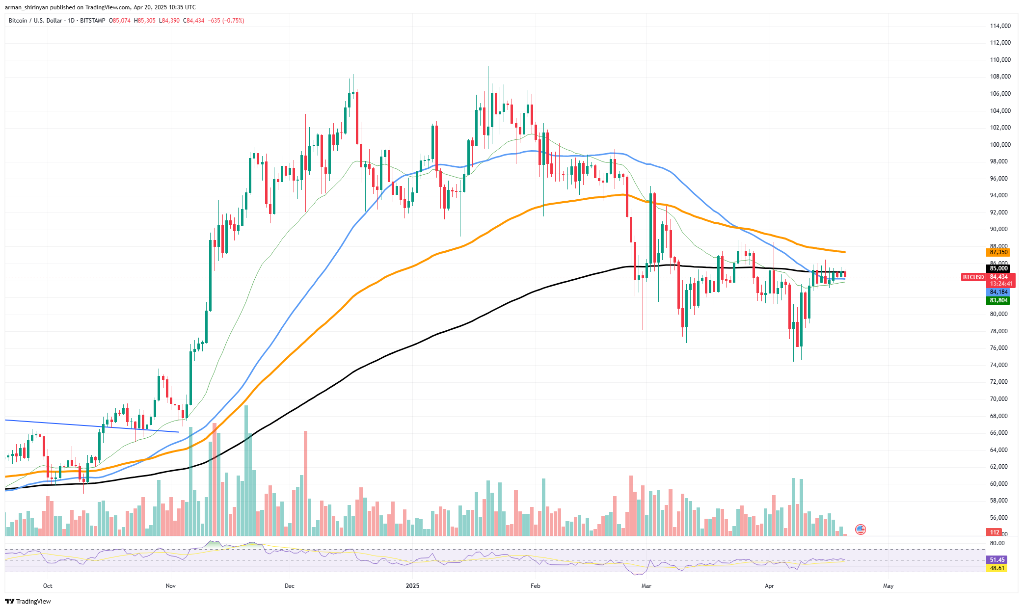Bitcoin is currently experiencing a critical juncture, squeezed between two significant exponential moving averages (EMAs), resembling a classic price squeeze. While bulls may hold a slight edge, this chart tension suggests a potential volatility-driven breakout in either direction.