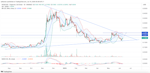 As the chart illustrates, the Bollinger Bands are expanded, and the price has rebounded from the lower band, approaching the average band. A rise above this range could propel the token towards the pattern's resistance and potentially trigger a breakout towards the upper Bollinger Band at $0.25. Furthermore, the MACD indicates a potential bullish crossover as selling pressure diminishes.
