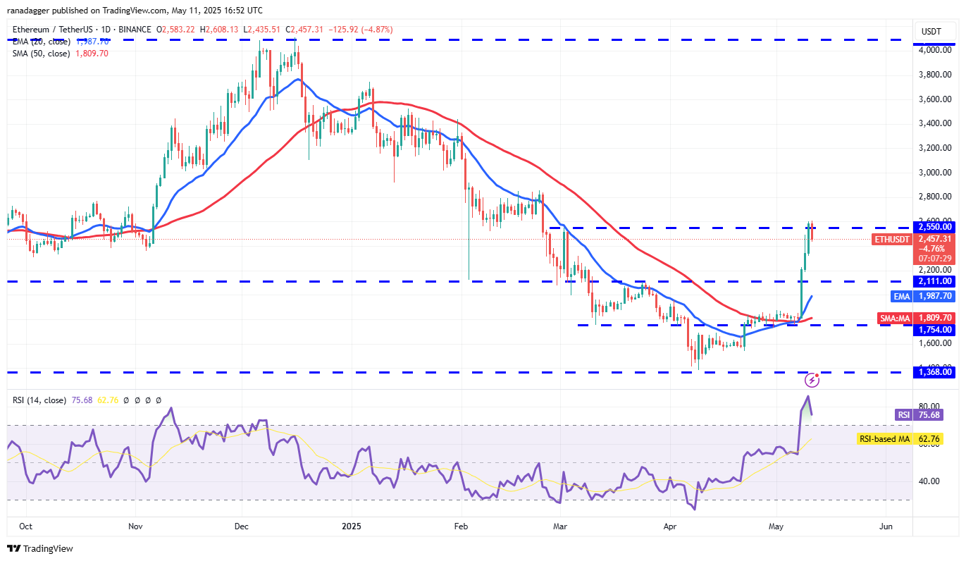 Ether (ETH) surged from $1,808 on May 8th to $2,600 on May 10th, demonstrating strong buying pressure.