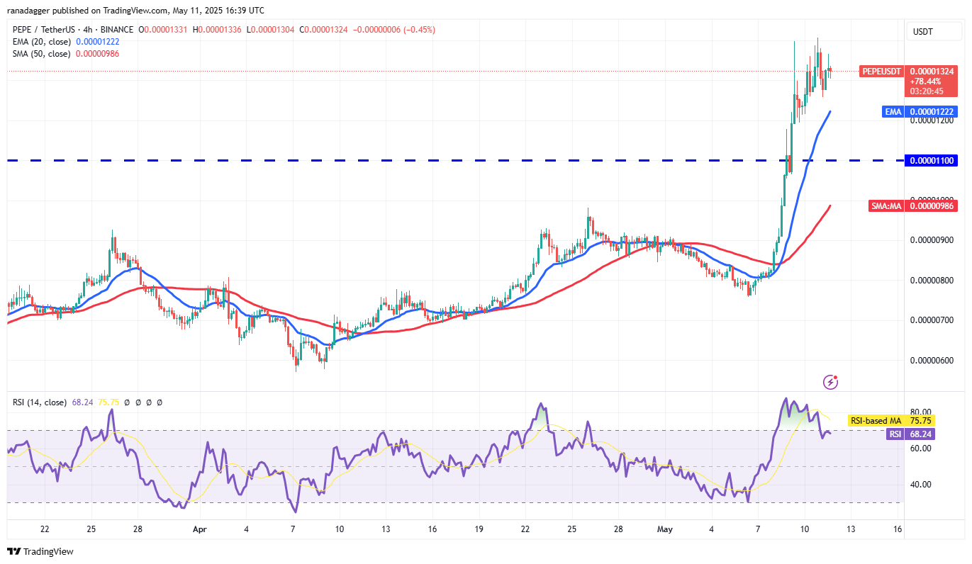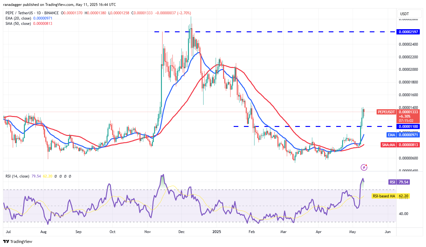 Pepe (PEPE) rallied significantly from the 50-day SMA ($0.000008) and broke above the $0.000011 resistance on May 8th.