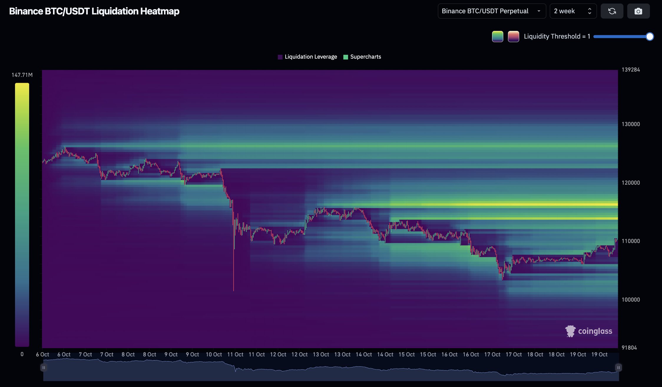 Data from Coinglass reveals large liquidity clusters between $111,000 and $120,000, indicating potential for a short squeeze. According to market analyst Crypto Rover, “Bitcoin short squeeze seems possible,” as liquidation heatmaps show leveraged short positions stacked above current price levels.