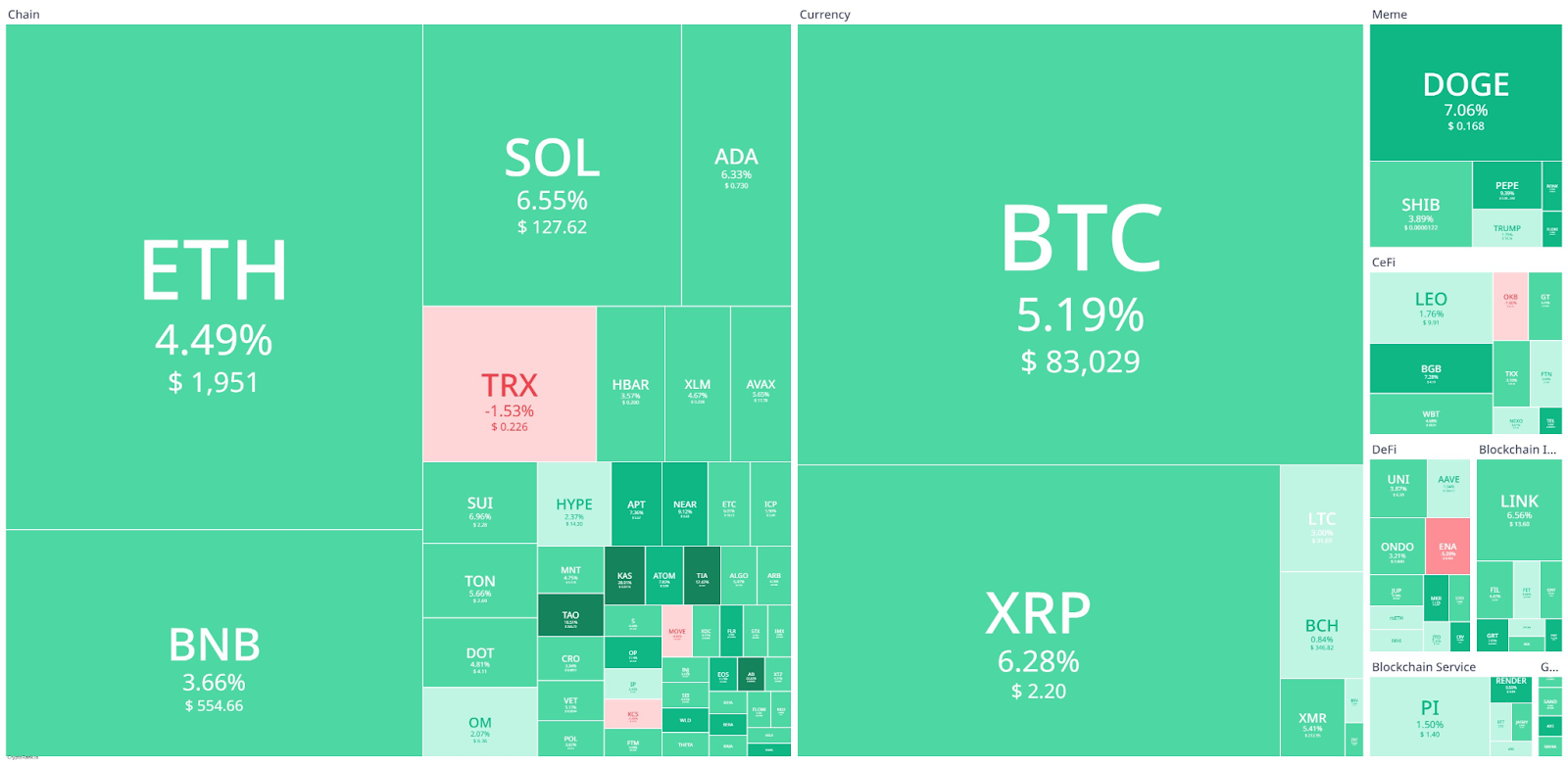 Conversely, Tron (TRX) fell 1.53% to $0.226. Meme tokens, however, performed well, with Dogecoin (DOGE) up 7.06% to $0.168 and Shiba Inu (SHIB) advancing 3.89%. Blockchain infrastructure tokens, such as Chainlink, also saw gains, increasing 6.56% to $15.60. Centralized finance tokens rose 1.76%, while decentralized finance token Uniswap (UNI) increased by 3.79%. The overall market sentiment is bullish, with most assets trending upward.