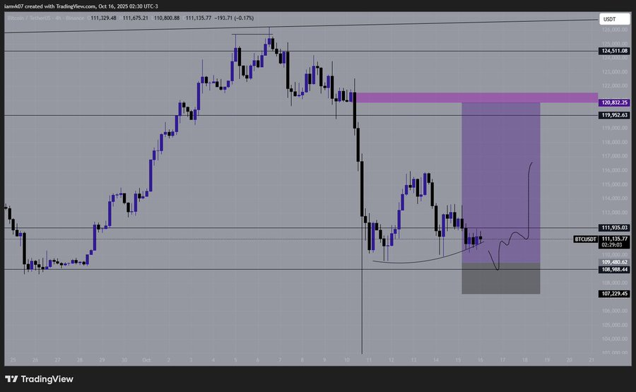 Bitcoin is trading around $111,100 after being rejected at $120,800. Sellers are still aggressive, but buyers are defending the lower zone. The chart displays a possible accumulation phase at around $110,000, indicating a momentum towards recovery in the short term.