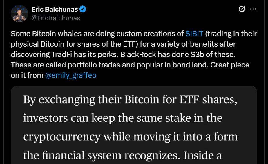 The participants of the Bitcoin whales category have transferred more than $3 billion in the iShares Bitcoin Trust (IBIT) at BlackRock, one of the largest exits out of self-custody in the last 15 years. Analysts believe that such a move occurs after the SEC changed its rule to enable in-kind redemptions of ETFs, allowing investors to save tax on sales.