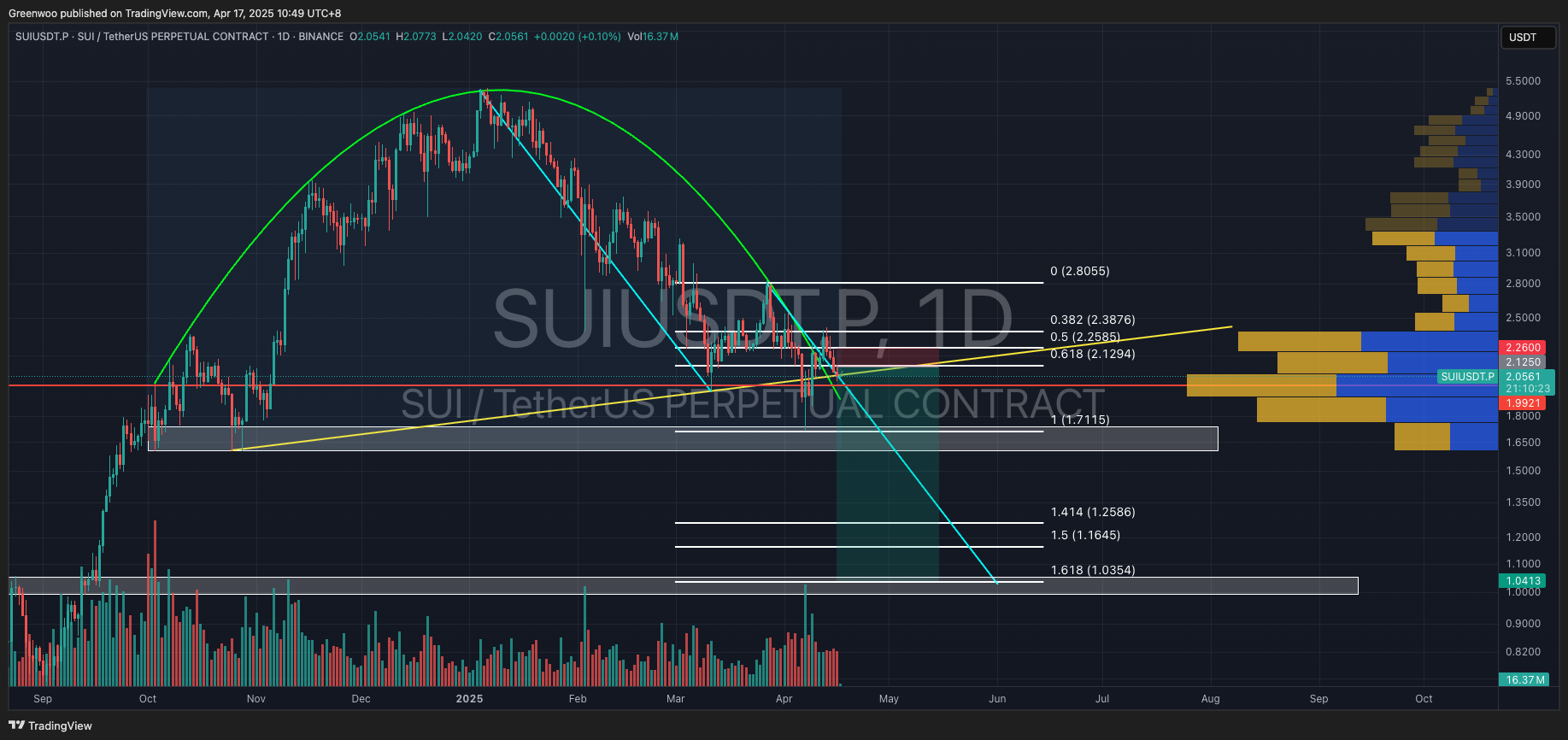 SUI has underperformed recently. After multiple failed attempts to surpass its all-time high, the price exhibits clear weakness. A steady decline since January 5th has formed a rounding top (saucer top). A recent break below the neckline and subsequent pullback to the Fibonacci 0.382 level, followed by four consecutive days of decline, further confirms this bearish trend.