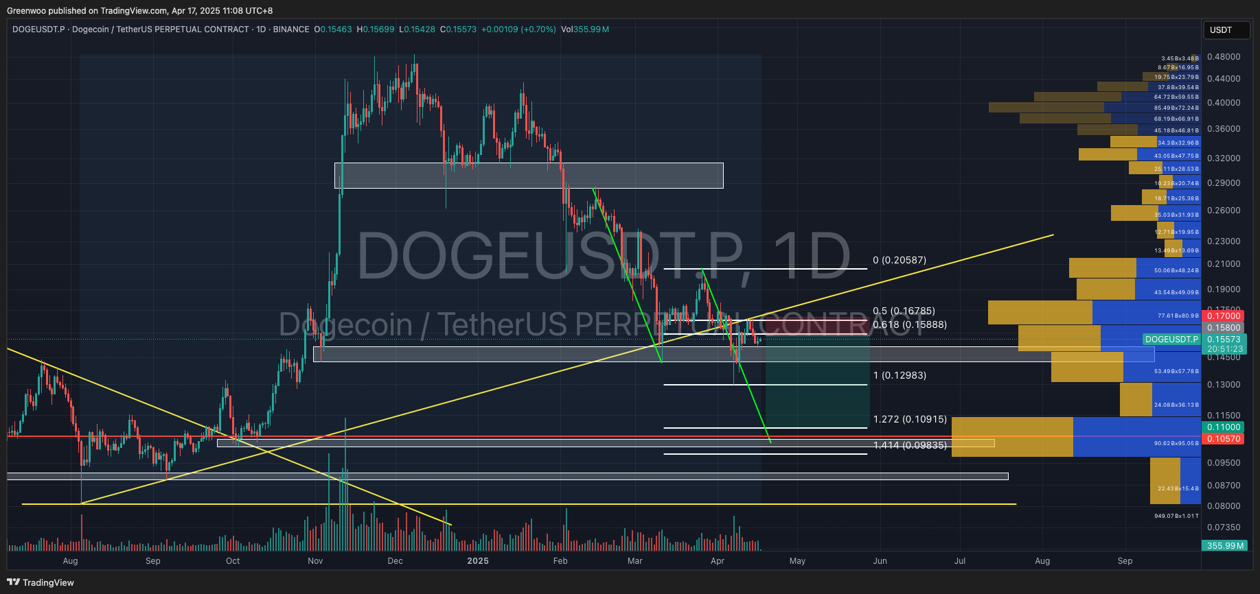 Pattern analysis indicates a target price around $0.105, situated between the Fibonacci 1.272 and 1.414 levels and aligning with a high-volume support zone. This convergence of technical indicators suggests a strong case for shorting DOGE.