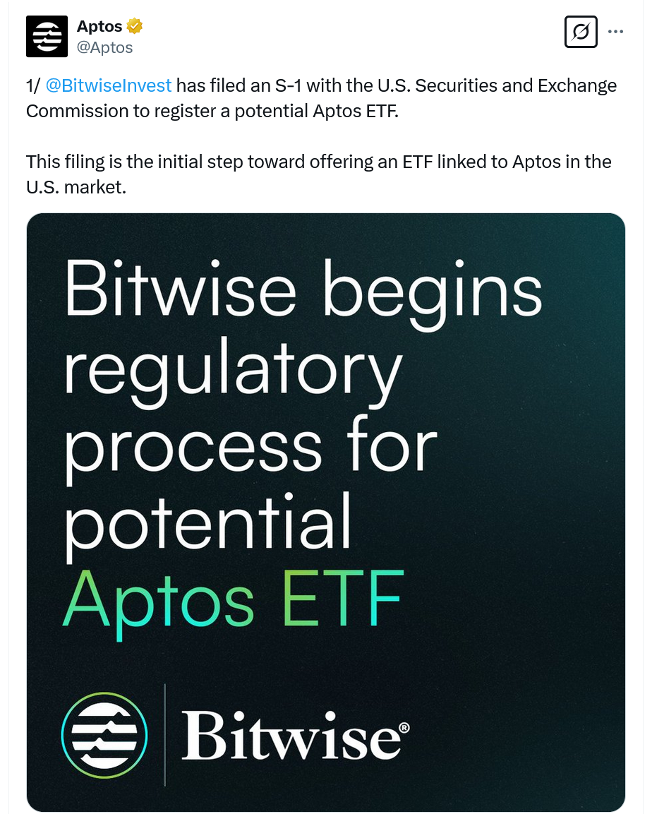 Crypto asset manager Bitwise has filed to list a spot Aptos (APT) exchange-traded fund (ETF) in the US. Aptos, a token created in 2022 by a team led by two former Facebook (now Meta) employees, is the focus of this new filing.