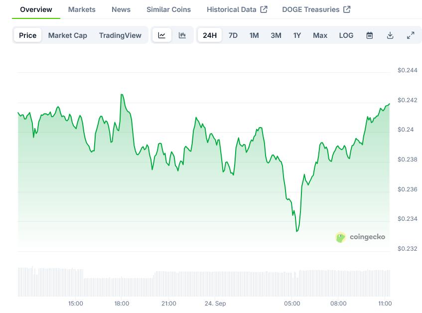 Dogecoin (DOGE) continues to trade in a narrow range, struggling with resistance near $0.245 and support around $0.232. Current Dogecoin (DOGE) technical analysis indicates that momentum is weakening. The lack of updates or ecosystem development makes DOGE highly reliant on market sentiment, especially retail-driven news and social media promotion.