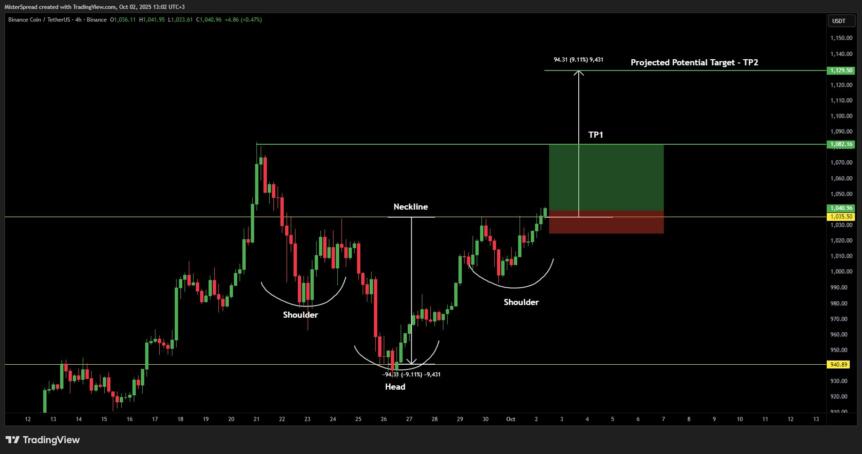 Within an ascending channel pattern, BNB’s ongoing uptrend could push its price toward $1,130 — approximately 6.75% above current levels — aligning with the 1.618 Fibonacci retracement. This target coincides with a breakout point derived from an inverse-head-and-shoulders (IH&S) pattern identified by traders.
