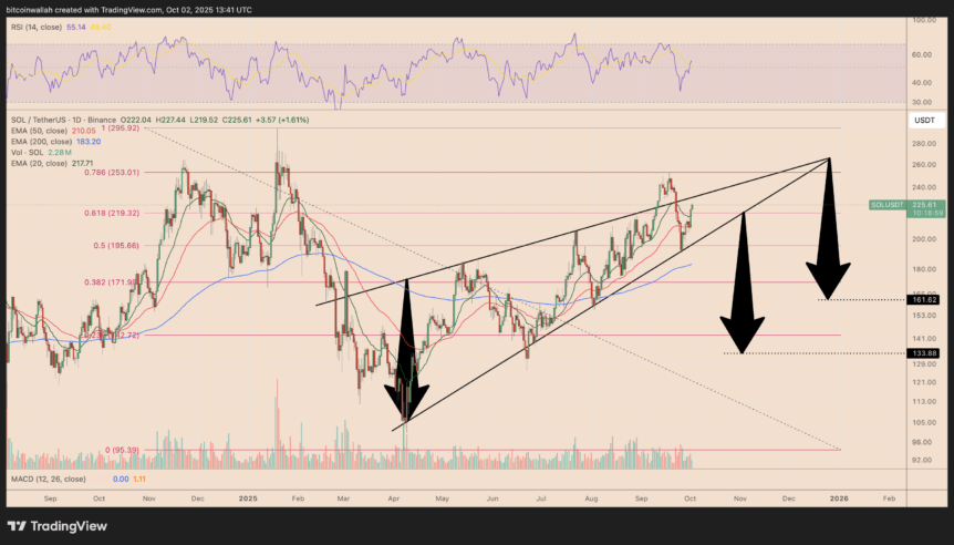 Solana (SOL) has already gained 9% in October, trading near $227.50 on Thursday, bolstering expectations of reaching $250 soon. Its recent upward trajectory is shaped by a rising wedge pattern that emerged since February, with the price hovering near the wedge’s upper trendline.