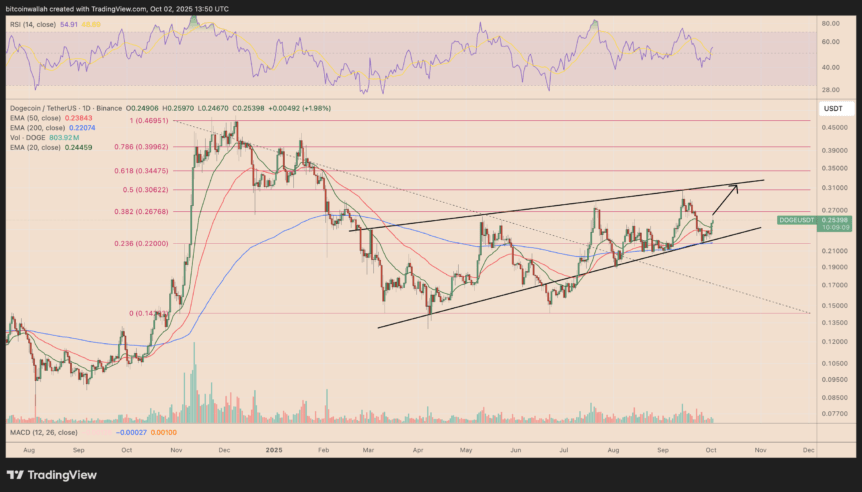 Failure to hold support at around $0.25—specifically below the 20-day EMA—could see DOGE retreating toward the channel’s lower trendline near $0.22, aligning with the 0.236 Fibonacci retracement. Analysts suggest that, depending on market conditions, Dogecoin could reach $1 in the coming months, driven by growing institutional interest and positive sentiment in the crypto markets.
