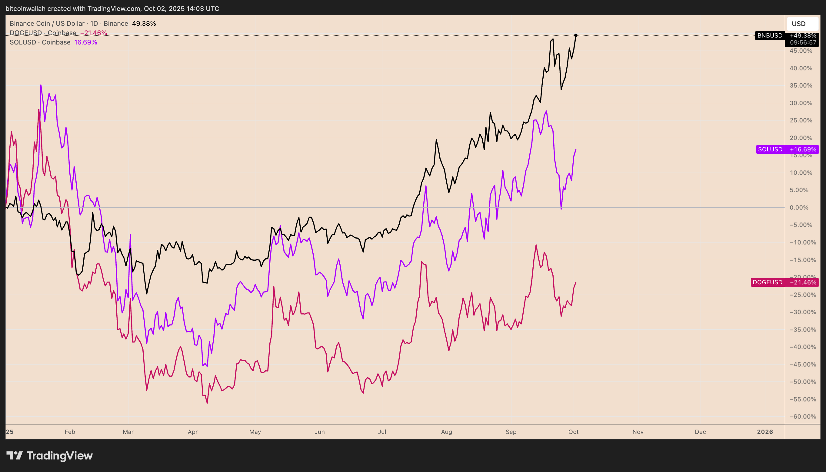 BNB (BNB), Solana (SOL), and Dogecoin (DOGE) opened October in the green, echoing broader crypto market gains as “Uptober” euphoria builds.